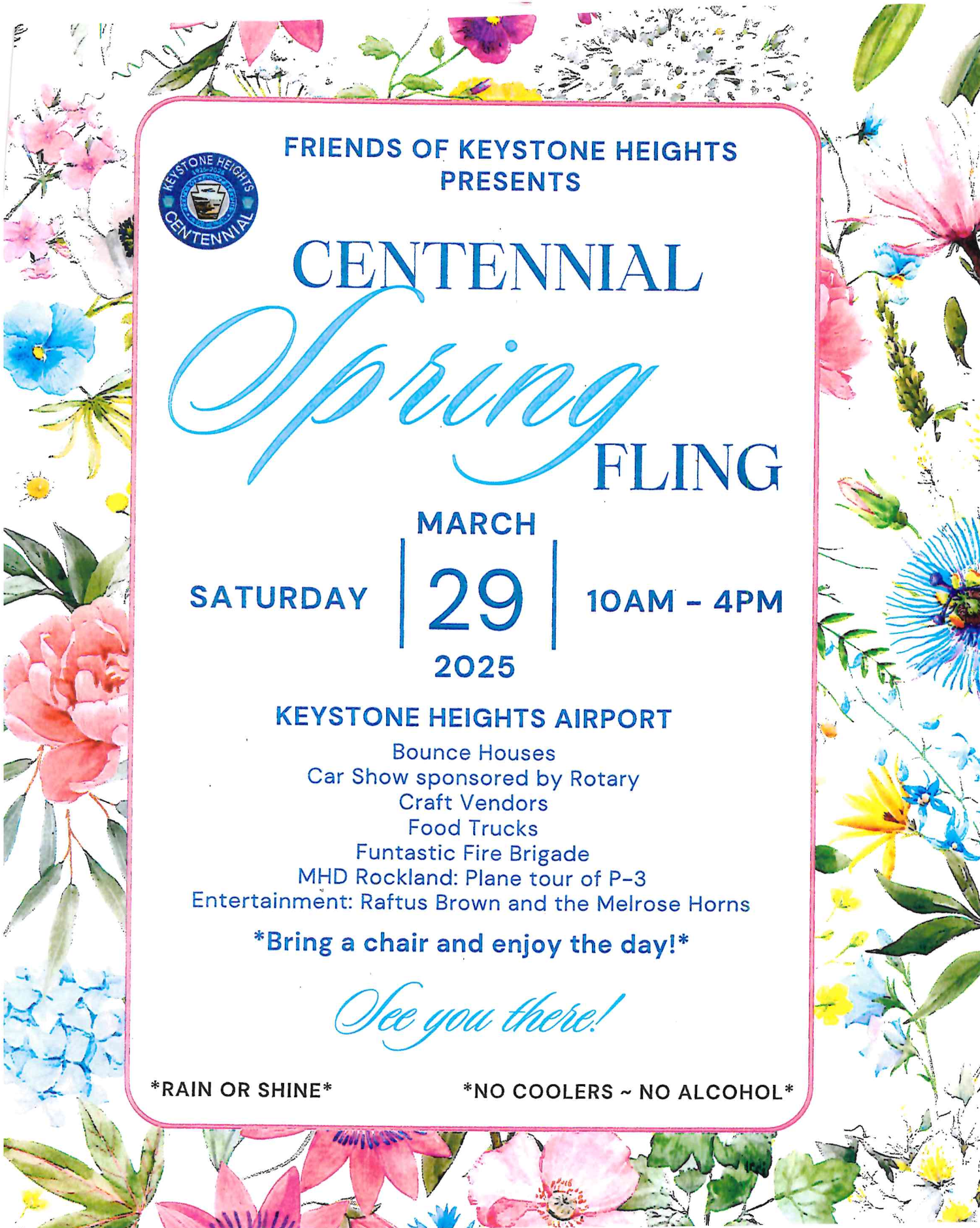 Friends of Keystone Heights presents the Centennial Spring Fling, celebrating 100 years of Keystone Heights, FL! Enjoy a day of bounce houses, craft vendors, food trucks, entertainment, a car show and more. Featuring a plane tour of P-3! Bring a chair and enjoy the day! Rain or Shine.